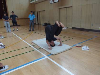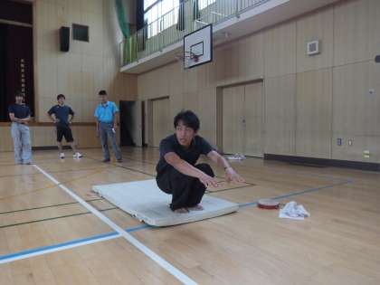 リーダーの先生です。子どもが陥りやすい前転を見せてくださいました。