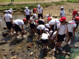 早速、魚つかみ。水が冷たくて気持ちいい(^。^)なんと、一人6匹、4匹とつかまえる子もいました。魚つかみ名人です!