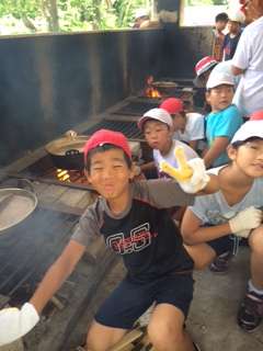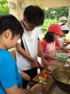 野菜を食べやすく切っています。火をおこす子は、熱さと煙との戦いです。