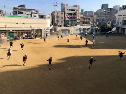 6年生がうまくリードして凧をあげます。園児に頼りにされて、6年生も笑顔いっぱいです。寒さ厳しい運動場ですが、ほっこりさせてくれます。