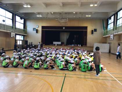 海老江東小学校、鷺洲小学校、海老江西小学校、八坂中学校下3小学校が海老江西小学校に集まってスポーツを通した交流を行いました。各校、赤、青、黄、緑4チームに分かれて混合チームを作り、玉入れ、台風の目、綱引きの3種目の競技を行いました。短い時間でしたが、子どもたちみんな楽しみながら交流することができました。3校が集まると海老江西の講堂が満杯になりました。