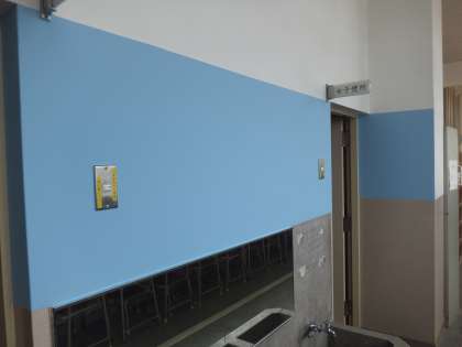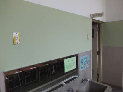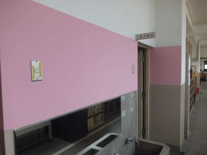 パステルカラーで、2階は若草色、3階は桃色、4階は水色です。