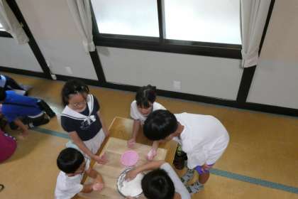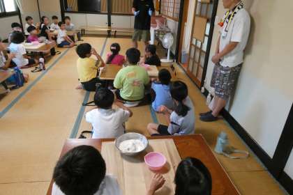 うどん作りが始まりました。説明を聞いて、班のみんなでうどん粉をこねます。