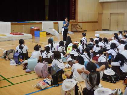 京阪神に大型台風が近づいていることを想定して、避難訓練を行いました。傘の持ち方や、暴風によって飛んでくるものに注意することなど、台風時の留意事項を各班で話し合っていました。そして、最後はきちんと並んで集団下校。集中して取り組む子どもたちの姿がありました。