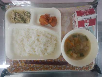 ヤンニョムチキン・油であげた鶏肉に「ヤンニョム」という、あまからいたれをからめて作ります。「ヤンニョム」とは、コチジャンやしょうゆ、ごま油などを混ぜ合わせた調味料のことです。ナムル・野菜を使った韓国・朝鮮のあえ物で、だいこんやほうれんそう、もやしなどさまざまな野菜で作られます。給食では、ビビンバの具としても出ます。