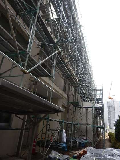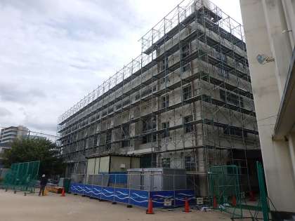 足場の組立工事が進んでいます。運動場側では、屋上まで組みあがってきました。来週も足場の組立工事が引き続き行われる予定です。安全には細心の注意を払って工事を進めていきたいと思います。