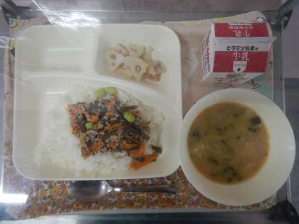 給食のジューシーは、豚ひき肉、にんじん、むきえだまめ、もずく、切りこんぶなどを使った、たきこみご飯風です。ご飯と具を混ぜて食べましょう。