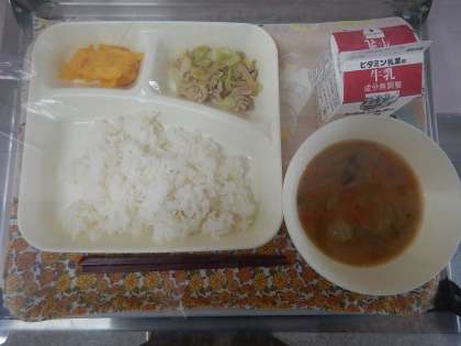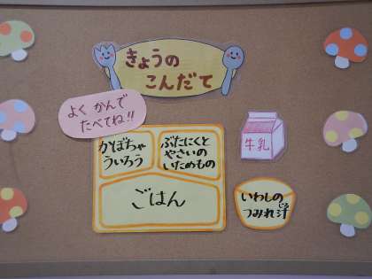 今日の給食は、いわしだんごとだいこん、ごぼう、にんじん、青ねぎなどが入った汁ものです。いわしだんごには、骨や歯をじょうぶにするカルシウムがふくまれています。