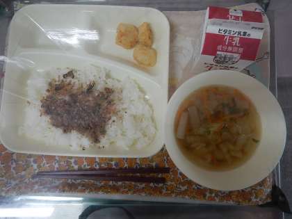 今日の「いかてんぷら」は、いかに小麦粉とでん粉で作った衣が付いたものを、給食室であげています。