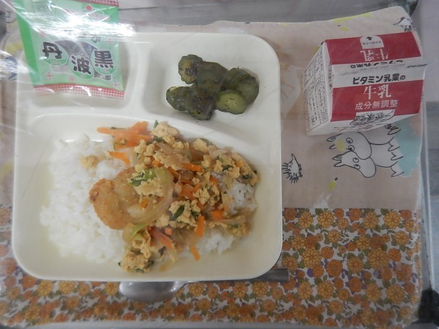 給食では、けずりぶしでとっただしで、たまねぎ、にんじん、青ねぎを煮て、調味料で味付けします。最後に卵を流し入れて作った具をご飯にかけ、さらにトンカツをのせて食べます。
