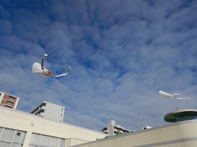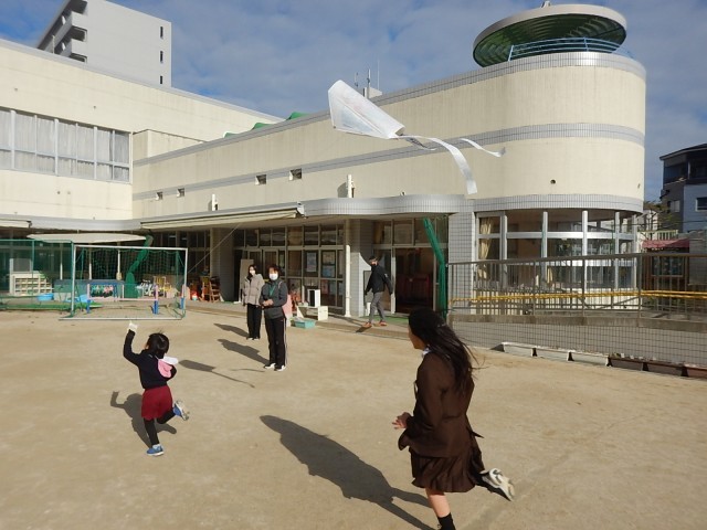 2時間目に6年生と園児が一緒に凧揚げをしました。