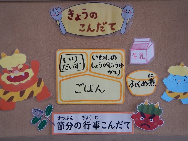 給食では、節分の行事献立として「いわしのしょうがじょうゆかけ」と「いり大豆」がでます。