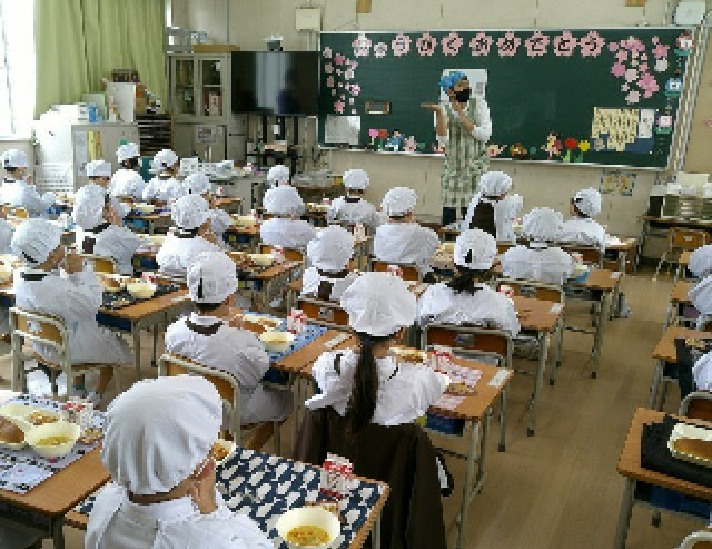 1年生の給食は、6年生が運搬から配膳まで手伝ってくれました。6年生が給食の準備をしている間、1年生は静かに座って待っていました。1年生の中には苦手な食べ物もあったようですが、しっかり食べていました。