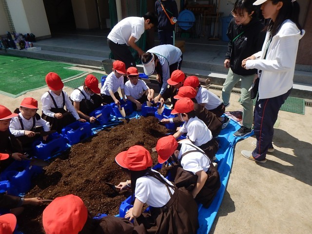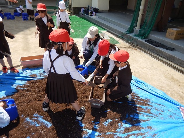 1年生が、アサガオを育てる学習のために、鉢植えに土を入れていました。スコップで何度も土を入れながら、鉢植えから土が溢れないよう土入れを行っていました。