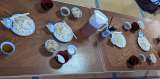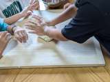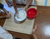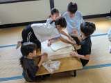4つの班のおうどんを先生たちは食べ比べさせてもらいました。どの班もこねるのがしっ...