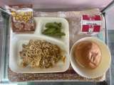 今日の給食献立は、ミニコッペパン、牛乳、やきそば、えだまめ、おさつチップスでした...