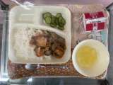 本日の給食献立は、マーボーあつあげどんぶり、牛乳、あっさりキュウリ、リンゴの缶詰...