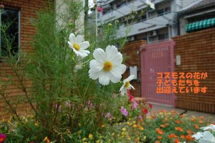 玄関の花壇にコスモスが咲いています。風にゆられながら、子どもたちを出迎えています。