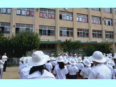 児童会が、校舎3階に運動会のスローガンを大きく掲げました。そして、今日の朝会では、大きな声と元気のよいパフォーマンスでみんなを励ましました。