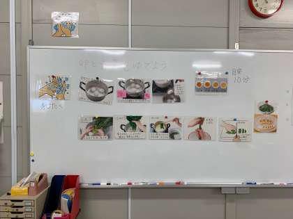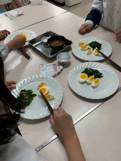 今日は家庭科で初めての調理実習をしました。メニューは「ゆで卵とほうれん草のおひたし」です。しっかり先生の話を聞いて、班の人と協力して調理できました。