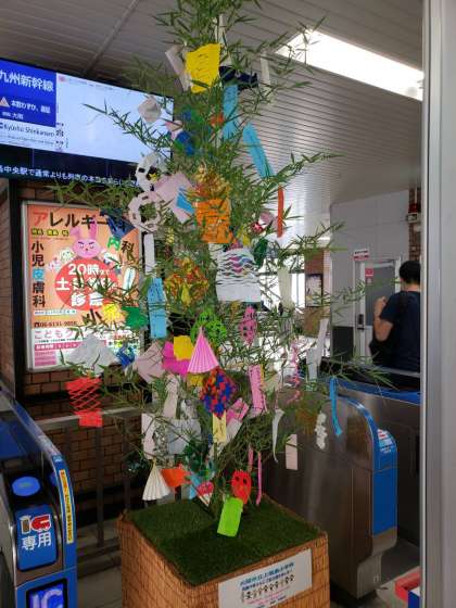 1年生が短冊を書いて仕上げた七夕かざりがJR福島駅の改札に飾ってあります。本日から8日までです。