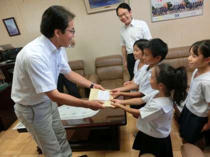 上福なかよし畑を見学いただいた後、先日パッケージ作りをした奈良漬を3年生から手渡しました。区長さんもとても喜んでおられました。
