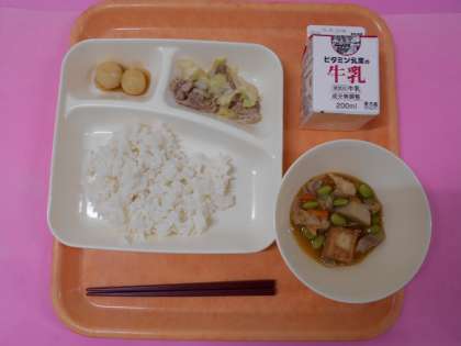 今日の献立は「鶏肉とさといもの煮もの、豚肉とキャベツのいためもの、みたらしだんご、ご飯、牛乳」です。