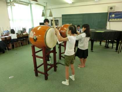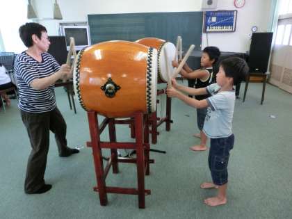 8月8日の盆踊りに向け、夏休みの和太鼓練習が始まりました。