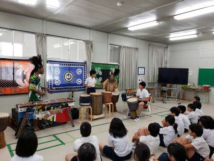 9月は3回にわたって6年生対象に文化芸術出前授業(アフリカンパーカッション)を行いました。南アメリカの打楽器演奏を教えてもらいました。