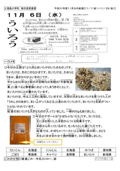 和菓子の「かぼちゃういろう」が給食に登場