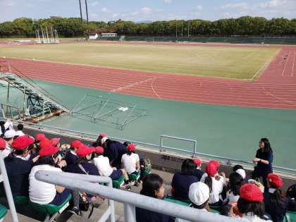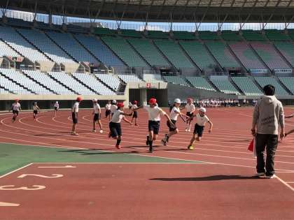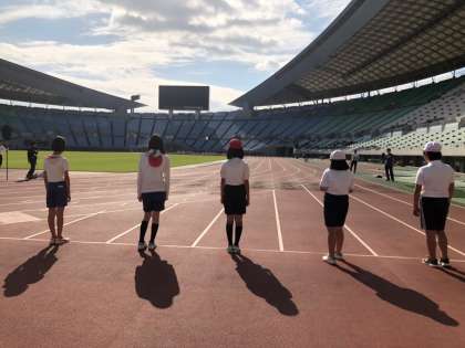 今日は6年生の子ども達がスポーツ交歓会に参加するため、長居陸上競技場へ出かけています。午前中は100メートル走の記録をとったり、400メートルリレーに参加したりし、本格的なトラックを走る体験をしました。