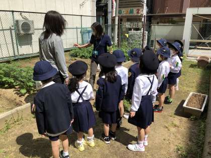 1年1組が、なかよし畑でなにわの伝統野菜の「鳥飼なす」と「ポップコーン」を植えました。