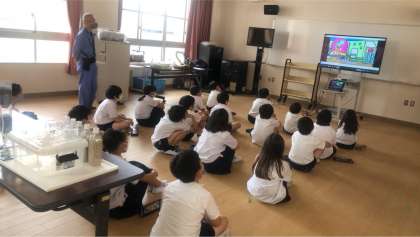 今日は水道局のスタッフの方々が水道教室の出前授業をしに来てくださいました。4年生は毎年、社会見学で浄水場に行っていますが、今年は行けなくなったためです。