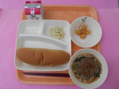 今日の給食は「黒糖パン、牛乳、タンタンめん、キャベツの甘酢づけ、さくらんぼ(缶)」です。