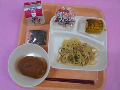 今日の給食は「黒糖パン(1/2)、牛乳、ウインナーときのこのしょうゆ風味スパゲッティ、焼きとうもろこし、アーモンドフィッシュ」です。