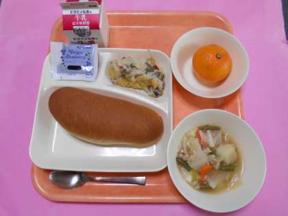 今日の給食は「コッペパン(ブルーベリージャム)、牛乳、鶏肉とじゃがいものスープ煮、きのこのドリア、みかん」です。