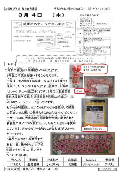 今日の給食は、6年生の卒業をお祝いする「卒業祝い献立」でした。