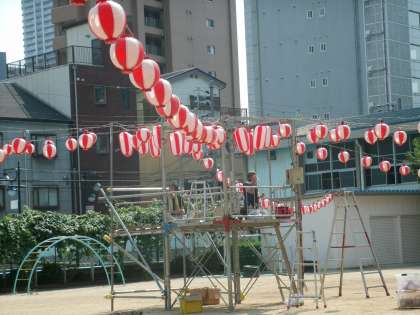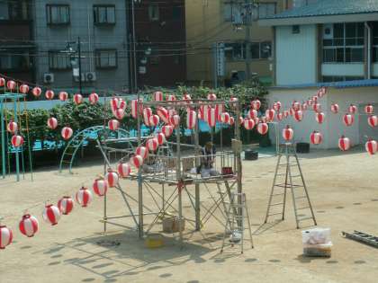 暑いなか、明後日の地域盆踊りに向け、地域の方々が提灯を用意されました。盆踊り当日を迎える雰囲気が高まってきました。子どもたちが太鼓を打つ腕も上がりました。当日6時25分から、櫓の上で子どもたちが練習を始めます。午後7時からが本番です。河内音頭など8曲。子どもたちの太鼓のバチさばきを楽しみに…。