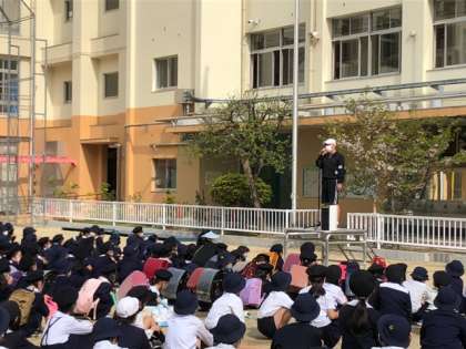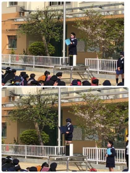 対面式が終わった後は、始業式です。校長先生から、「きれいな学校であるために、しっかり掃除をしよう」というお話があった後、担任、担当紹介、隅先生から学校生活についてのお話があり、児童代表のことばがありました。とても素晴らしい決意のこもったことばでした。
