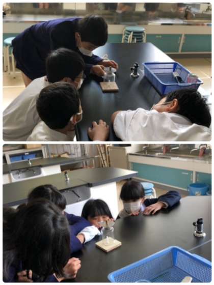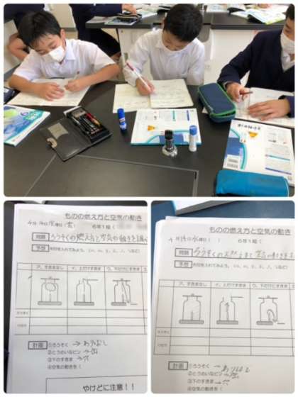 6年生が理科で、「ものの燃え方と空気の流れ」を学習しました。しっかりとノートを書きながら、実験の結果がどうなるのか、班で予想を立てていました。しっかりと手を挙げてそれぞれの考えを発表していました。