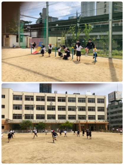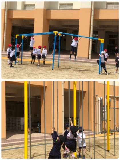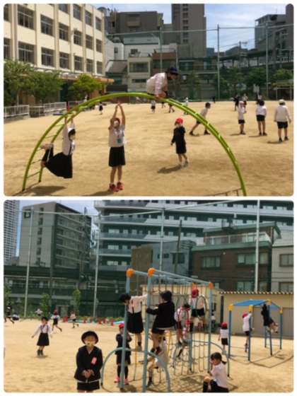 今日も元気いっぱいの上福っ子が、運動場で楽しく過ごしています。雲梯や登り棒、鉄棒なども人気です。