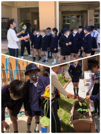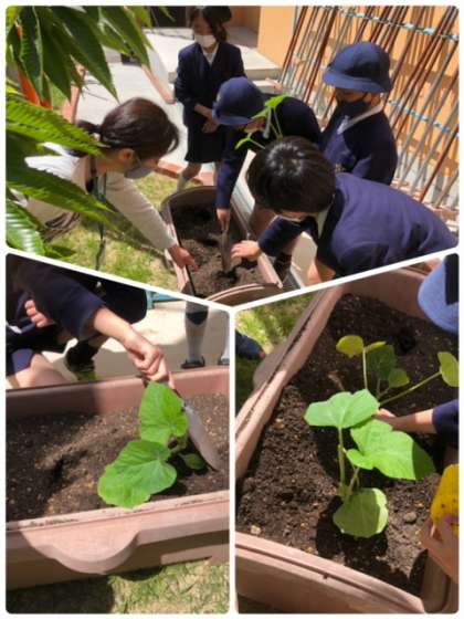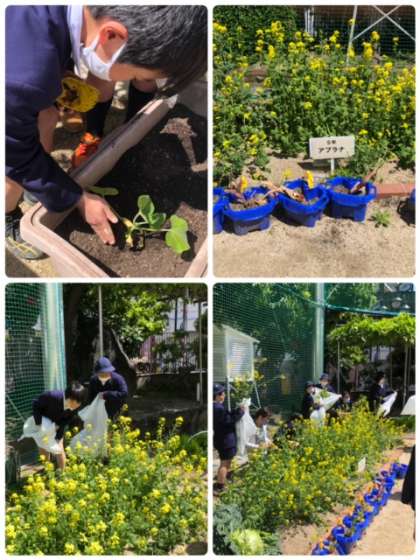 5年生がこれからの学習に使う、かぼちゃの苗を班ごとに植えました。かぼちゃは、伝統野菜の勝間南瓜(こつまなんきん)です。大きくなるのが楽しみです。また、学習を終えたアブラナを抜きました。