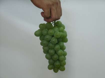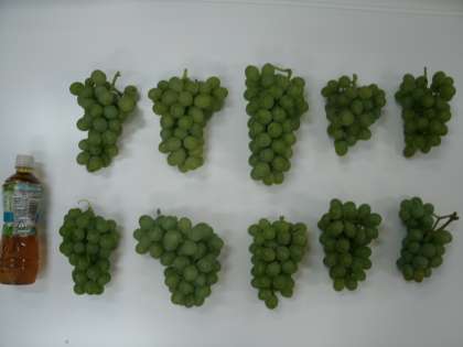 プール北側にあるブドウ棚、マスカットの立派な房を収穫しました。一粒いただきました、甘い。