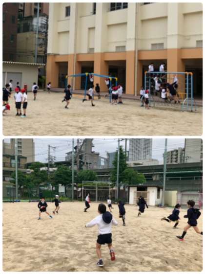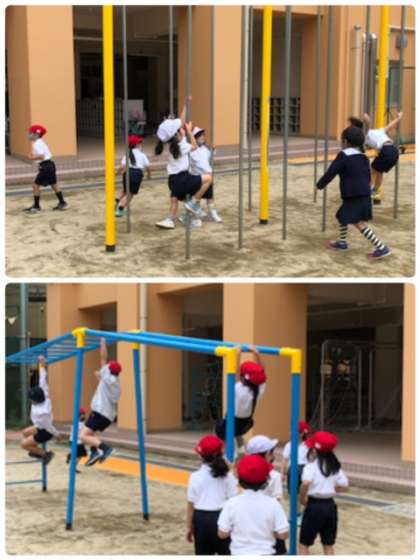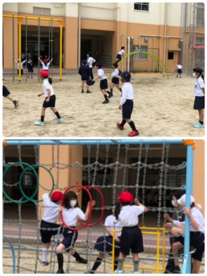 空は曇り空でも、子ども達はお構いなし。運動場を、所狭しと走り回ったり、遊具で遊んだりとげんきです。