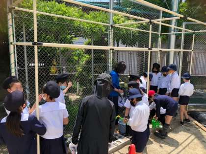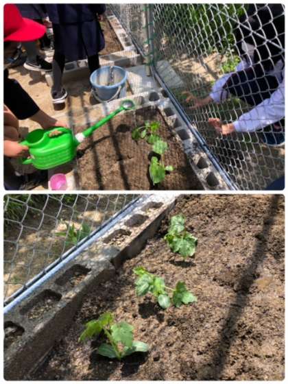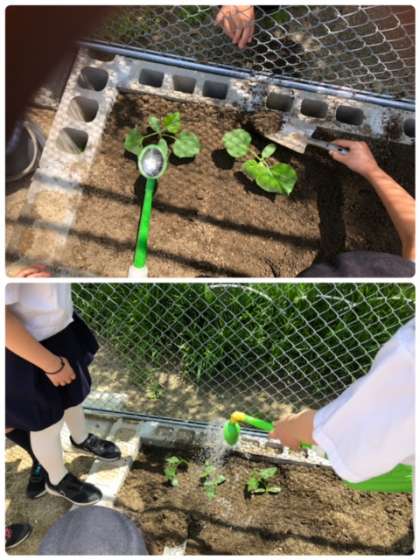 4年生が学習園に、理科の学習で観察する、ひょうたんとへちまを植えました。しっかり水をあげて、大きくなるように祈ってました。