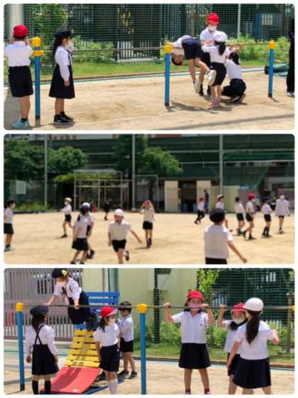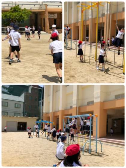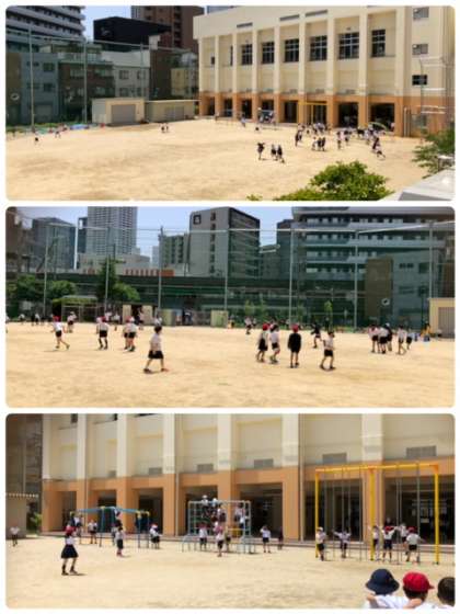 快晴のもと、今日も元気に上福っこが運動場を走り回っています。少し暑いように感じましたが、子ども達には、関係ないようです。
