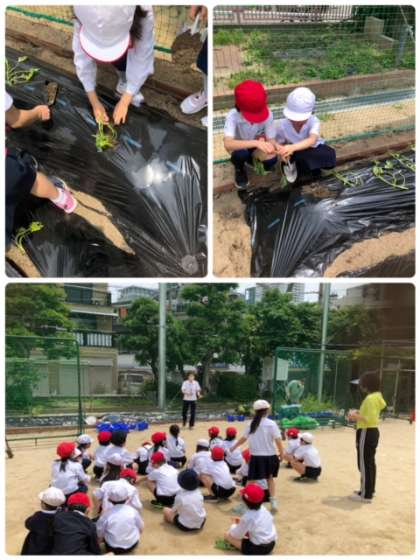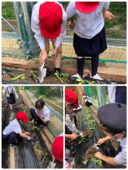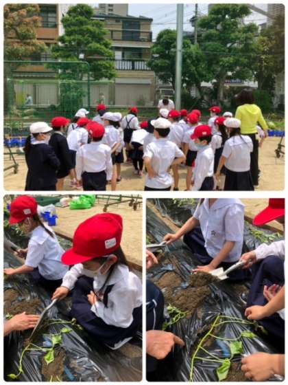 休み時間を挟んで2年2組が、さつまいも植えをしました。