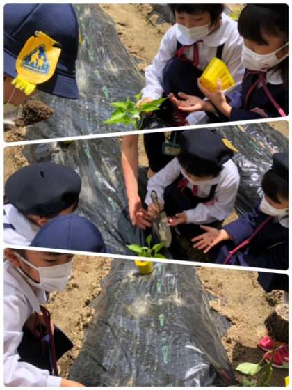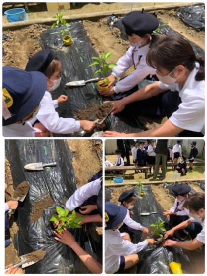 昨日の2年生に続き、今日は1年生がなかよし畑で、ピーマンとポップコーンを植えました。グループで協力しながらピーマンを植えたり、小さな小さなポップコーンの種を植えたりと頑張っていました。
