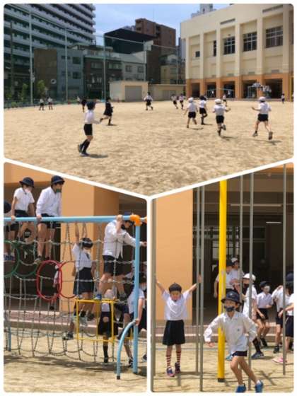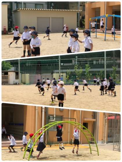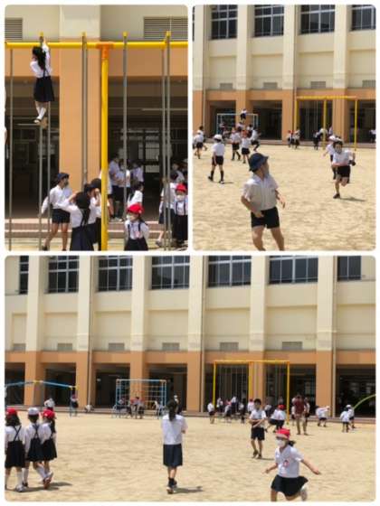 晴天の空の下、今日も元気に上福っ子が運動場を走り回っています。額には大粒の汗も見られました。