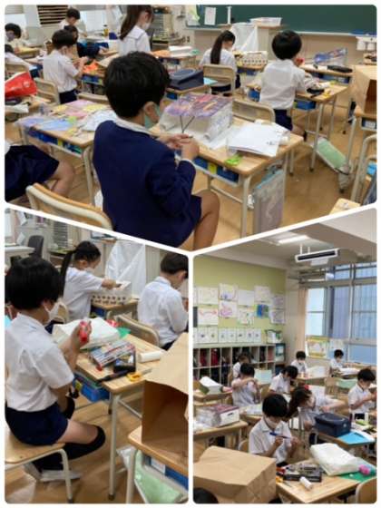 3年2組も同じように、袋の中の世界を表現していました。自宅から持ってきた材料も加えておもしろい作品ができていました。
